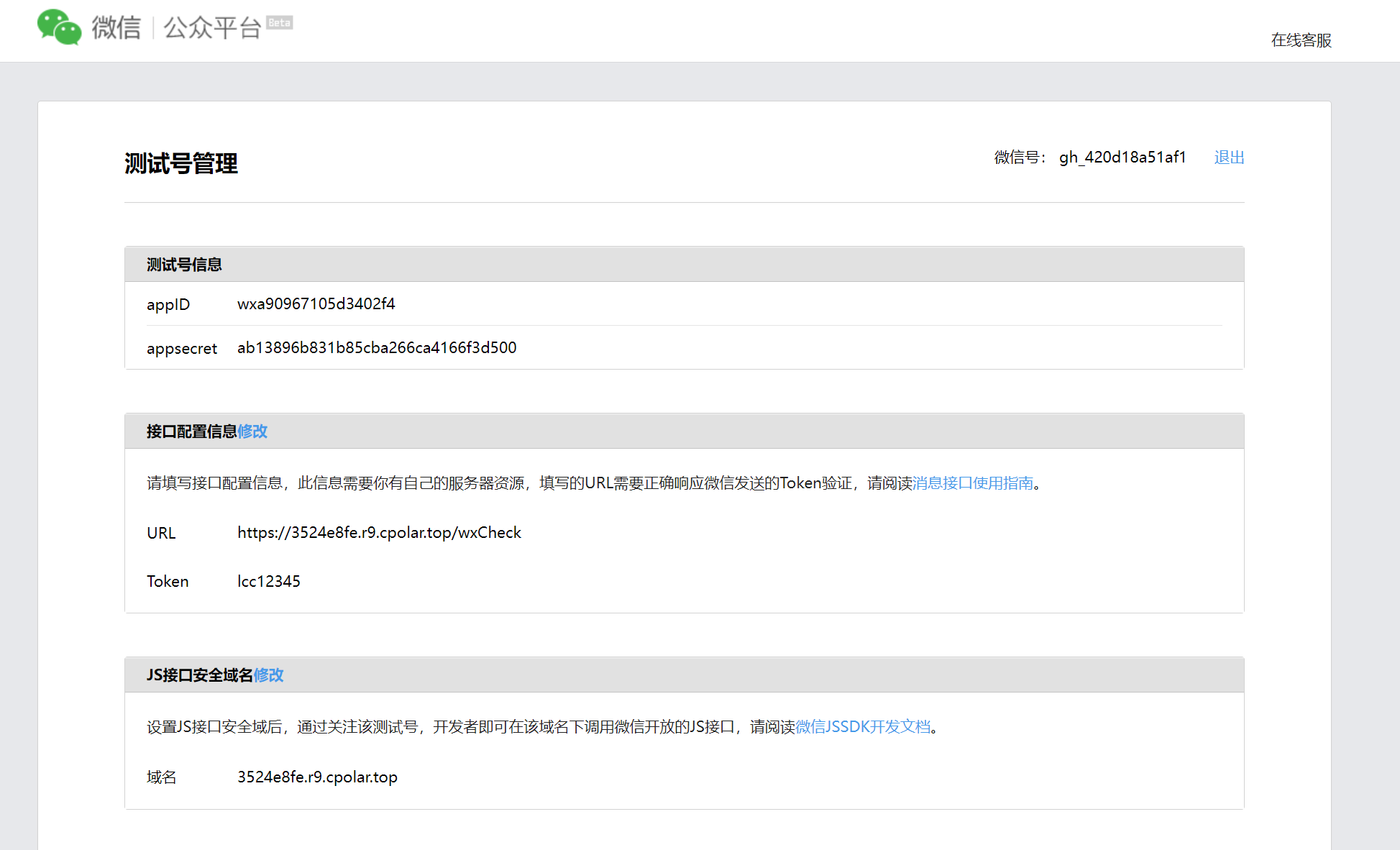 1. 测试号信息是自动生成的,注意后面需要替换WechatUtil里面的APPID和SECRET