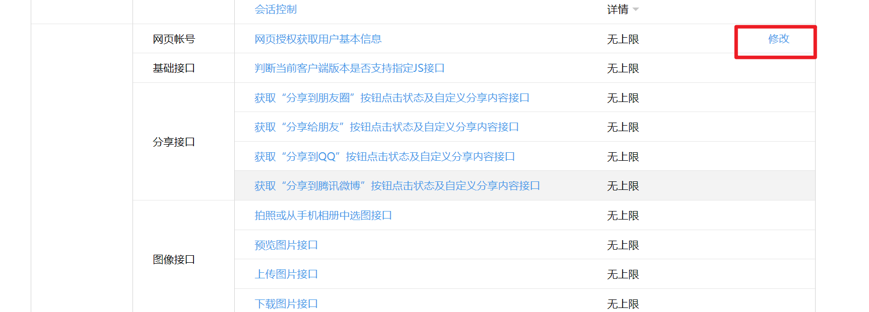 4. 找到网页账号,点击编辑,配置OAuth2授权域名